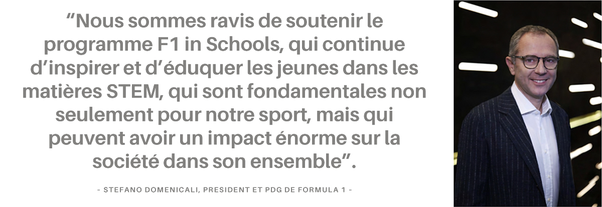 Développé pour initier les élèves aux disciplines STEM de la manière la plus attrayante possible – par la création d’une voiture F1® miniature – F1® in Schools est un projet éducatif sans pareil. Conçu pour les enseignants, avec l’aide d’ingénieurs et le soutien de F1®, ce programme met les élèves sur la voie rapide de la réussite dans le domaine des STEM, tout en leur procurant beaucoup d’amusement.