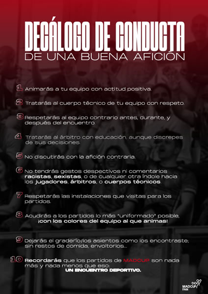 Los aficionados sois fundamentales para hacer de MADCUP un torneo de valores. La deportividad recae sobre todos, no solo los cuerpos técnicos y los jugadores… y este año ¡tiene premio! Para formar parte de los «aficionados premiados» debes registrarte antes del comienzo de MADCUP como aficionado. Te dejamos el enlace de inscripción a continuación: www.madcup.es/ranking_aficionado